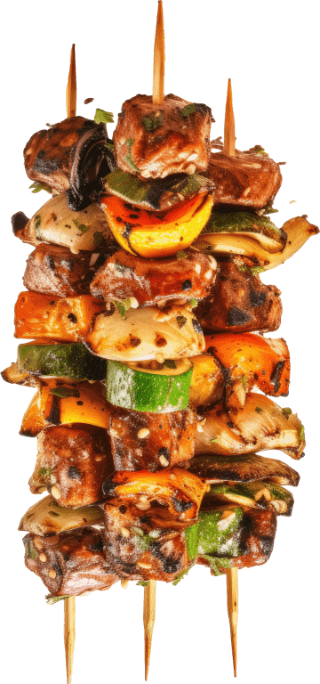38Brochettes de poulet ou de porc grillées, accompagnées de légumes, tzatziki, salade et pain pita.